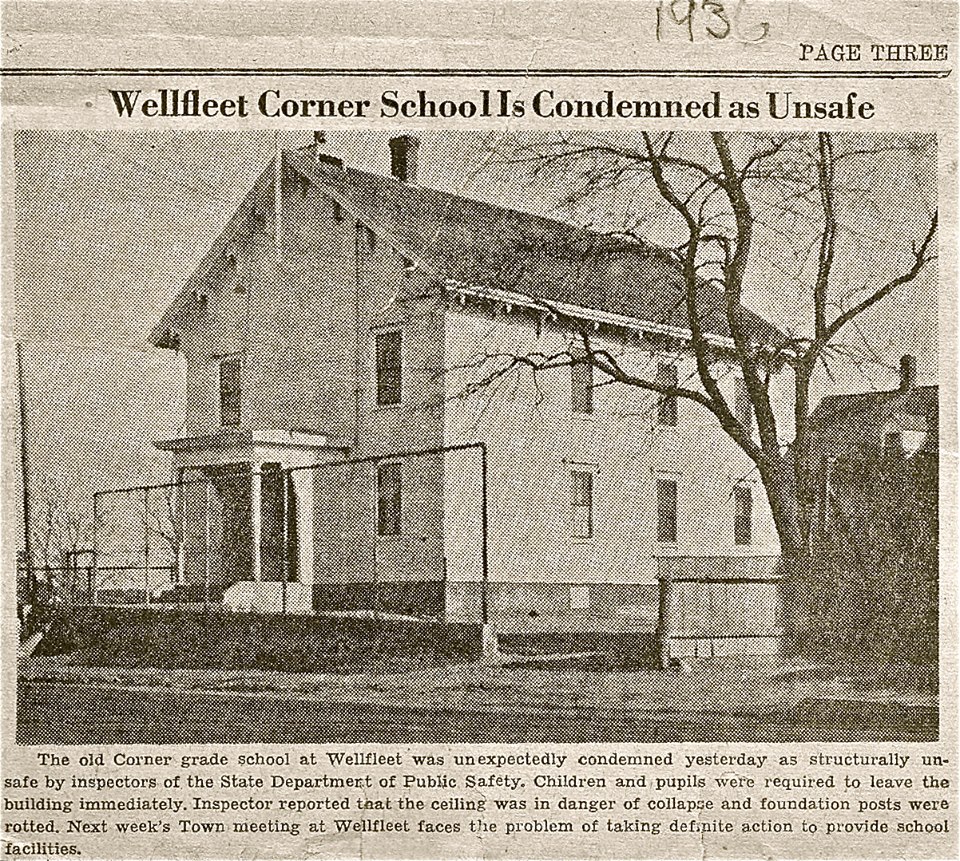 On that corner stood Wellfleet’s old elementary school, which was condemned by a building inspector in 1937. After securing state permission, the town financed a new school in 1938, built on the hill on Long Pond Road, where it stands today. In the meantime, the students had to be housed in temporary classrooms around town.